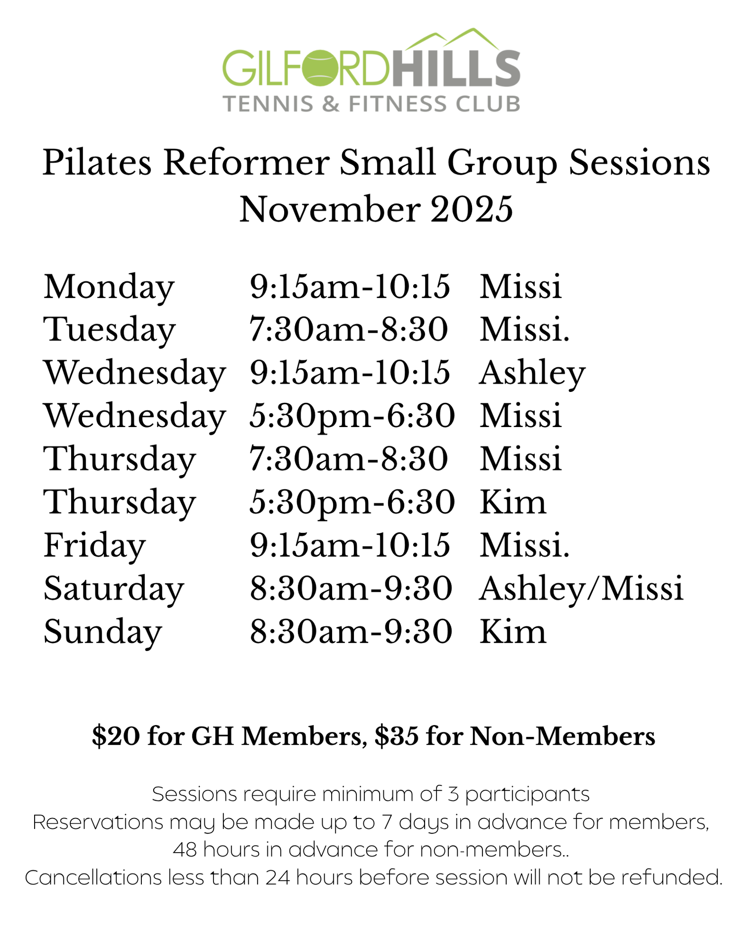 We have recently added Merrithew Reformers to our facility! Reservations for the small group reformer fitness sessions may be made through our Member Portal. Gilford Hills CLUB members are able to access reservations 7 days in advance, sessions are $20 with membership. Non-members may access reservations 2 days in advance, and sessions are $35. We have a 24 hour cancellation period.